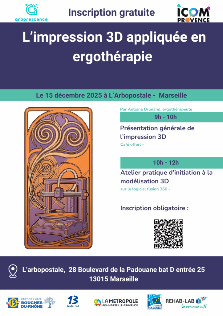 Vous êtes intéressé(e) par l’innovation technologique et l’ergothérapie ? Ne manquez pas cette matinée d’ateliers et de découvertes autour de l’impression 3D à Marseille, le 15 décembre 2025 à L’Arbopostale !