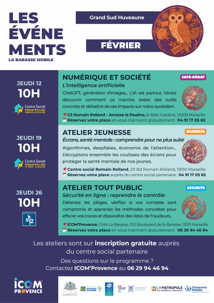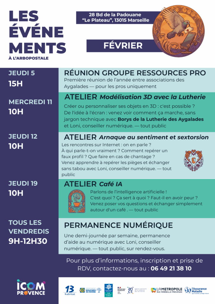 Le mois de février s’annonce riche en découvertes et en créativité ! Que vous souhaitiez explorer les nouvelles technologies comme l’impression 3D et l’IA, sécuriser votre navigation ou simplement obtenir de l’aide pour vos démarches, nos ateliers gratuits sont là pour vous.